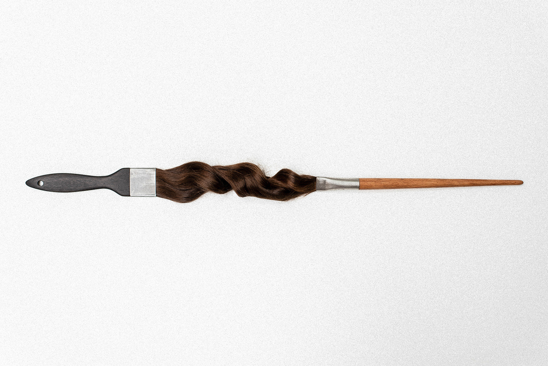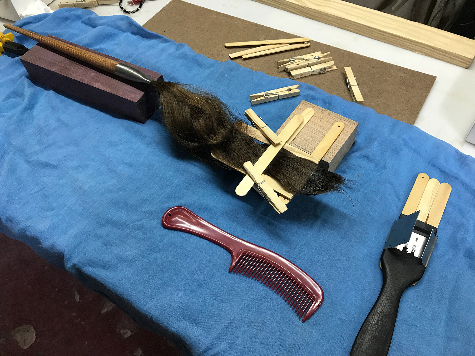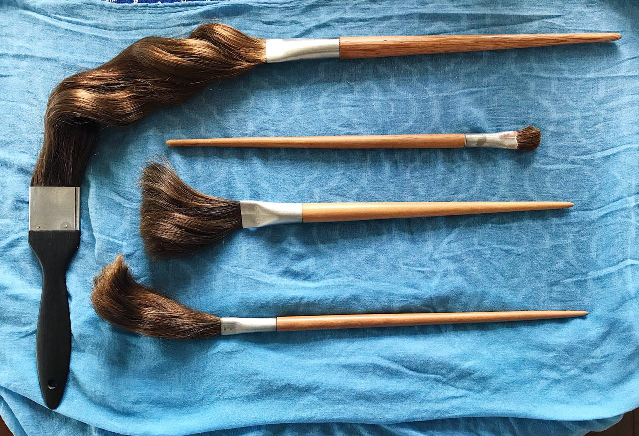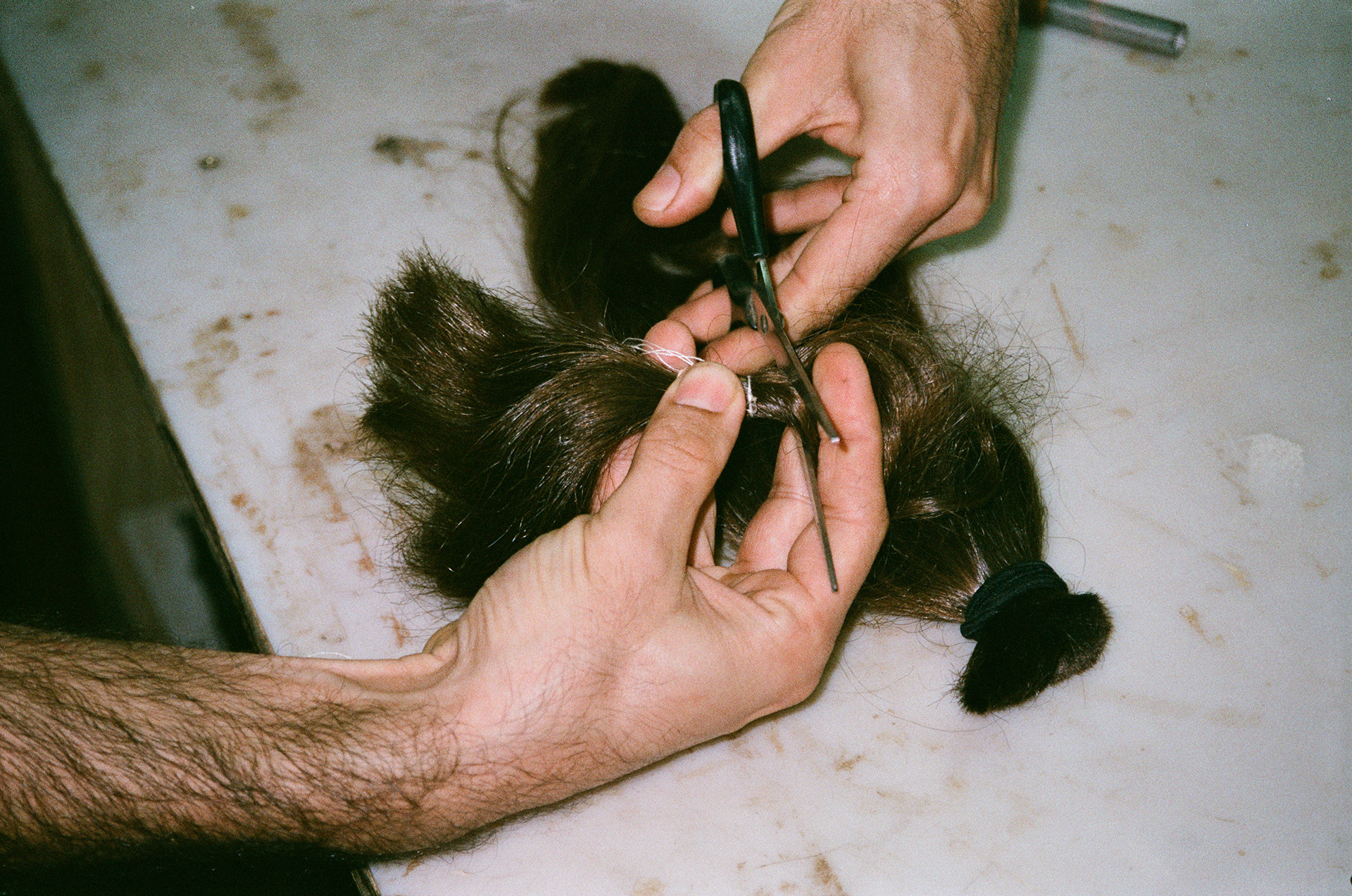 Fabricação de pincéis para a obra "Inútil", da artista Jade Marra, feitos com os cabelos de Luíza.